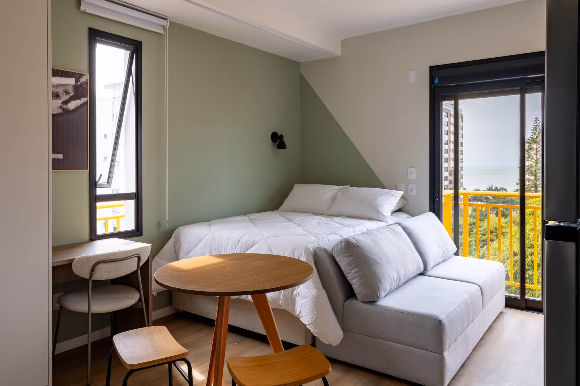 Com ambientes amplos e bem integrados, conta com cozinha equipada, espaço dedicado para home office, sofá e uma cama aconchegante — tudo planejado para uma rotina prática e confortável. E para quem deseja uma experiência ainda mais especial, algumas unidades incluem varanda, trazendo mais luz natural e conexão com o exterior. Um studio completo, moderno e versátil para viver bem todos os dias.
